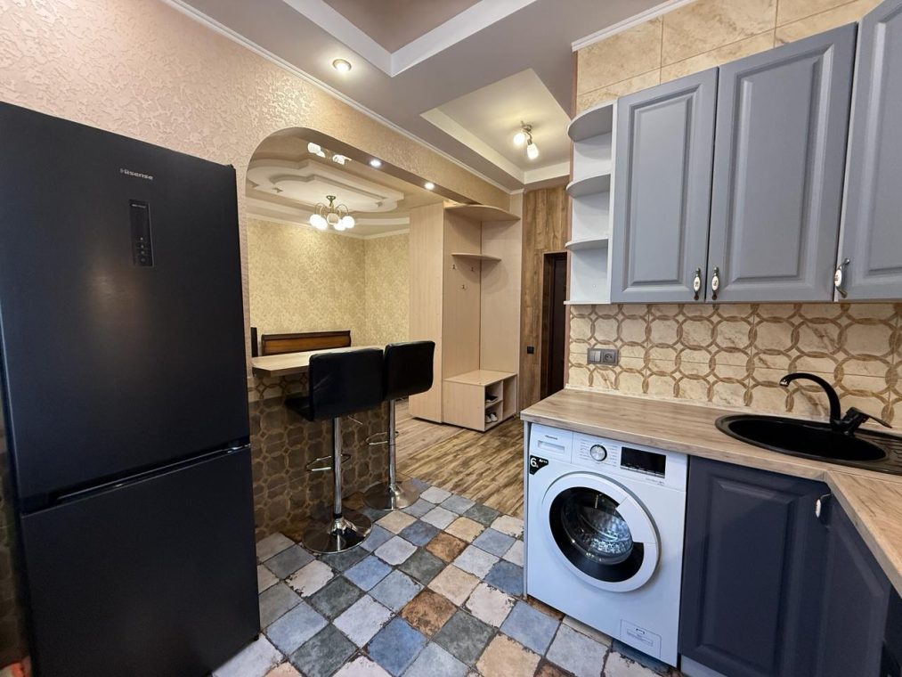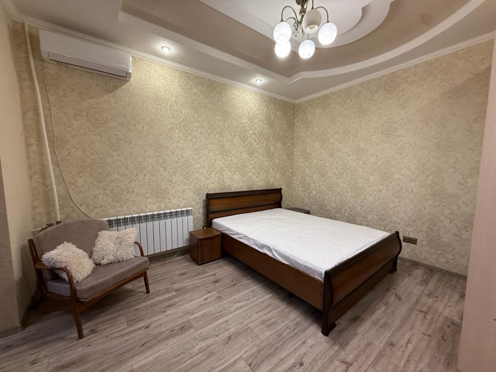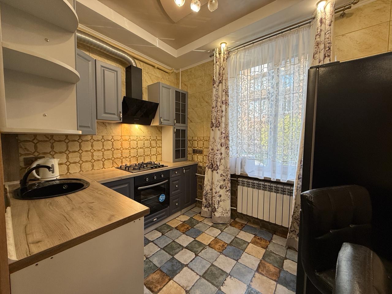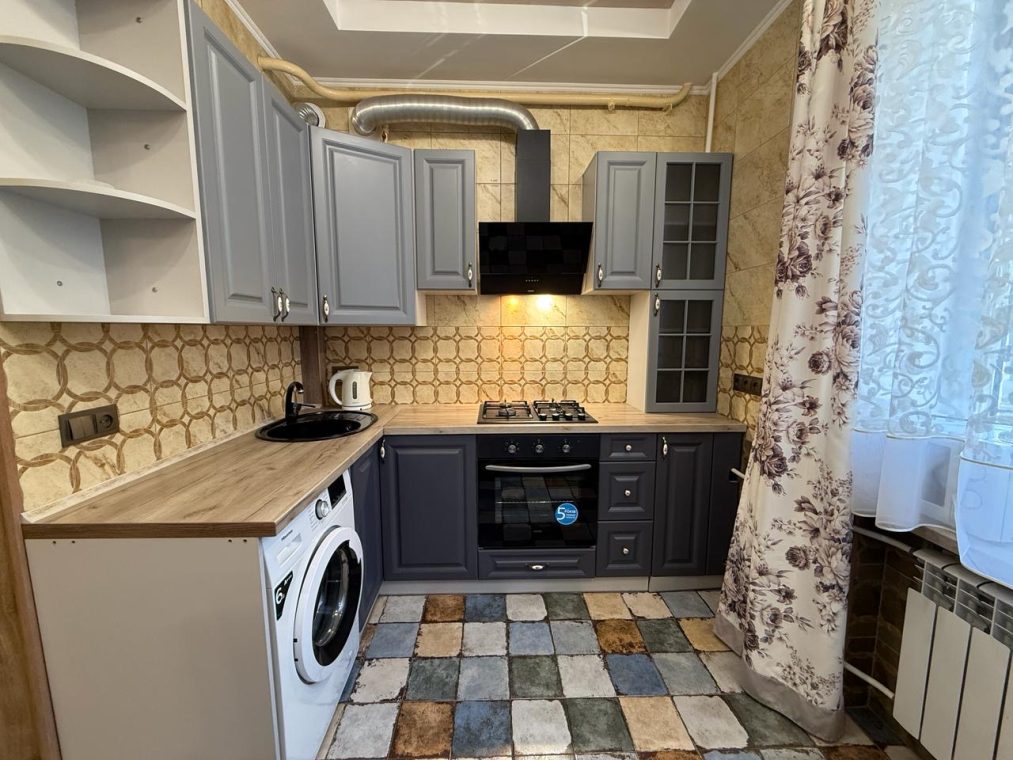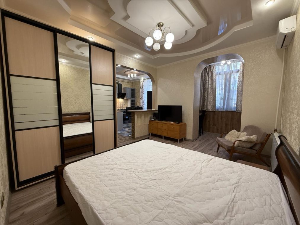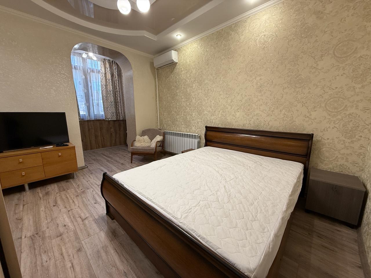 Квартира укомлектована всіма меблями та технікою: пральна машина, холодильник, ел. чайник, газ. плита, ел. духовка, витяжка, газ. колонка, мікрохвильовка, телевізор, кондиціонер, сушарка для рушників, праска, пилосос. Грати на вікнах. Тепла підлога у ванній кімнаті.