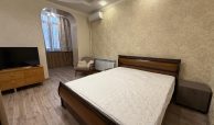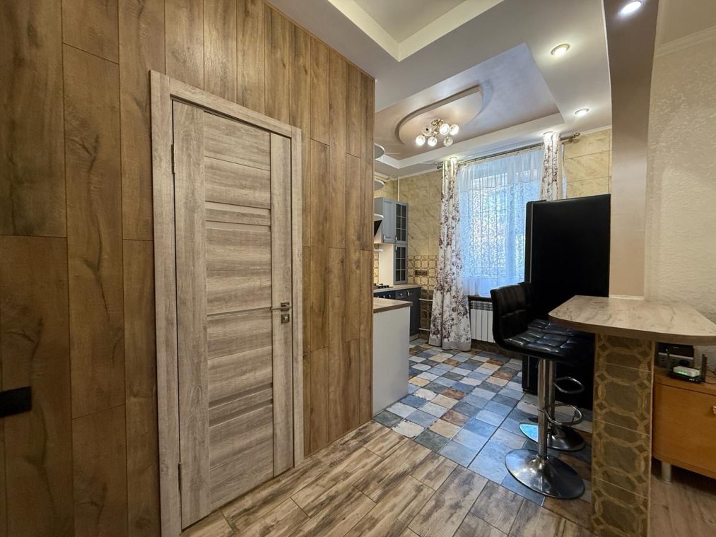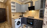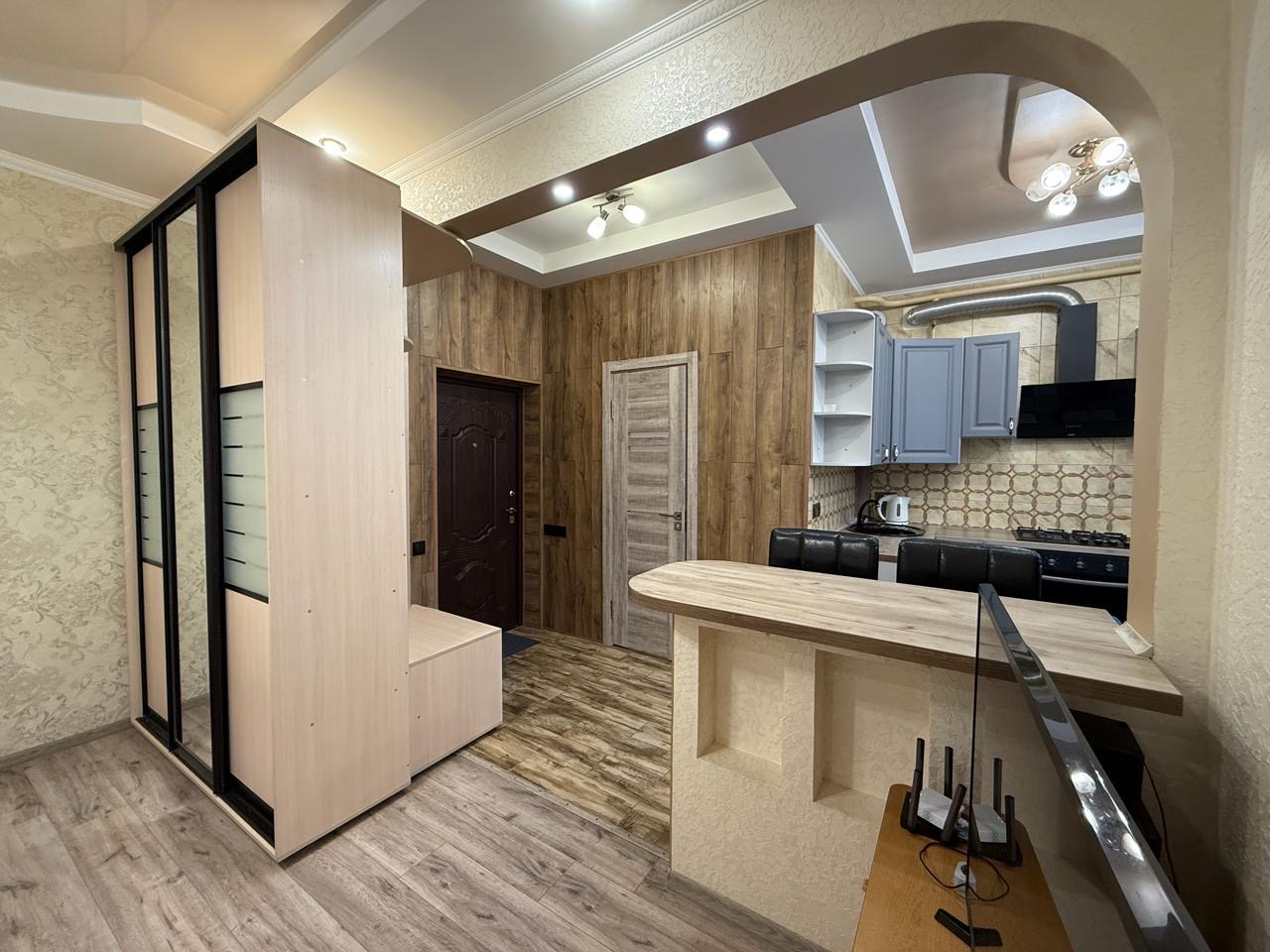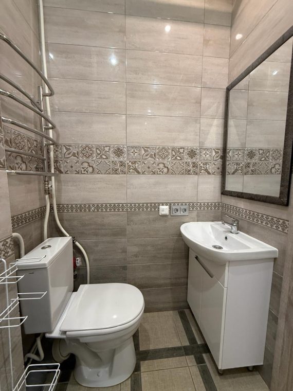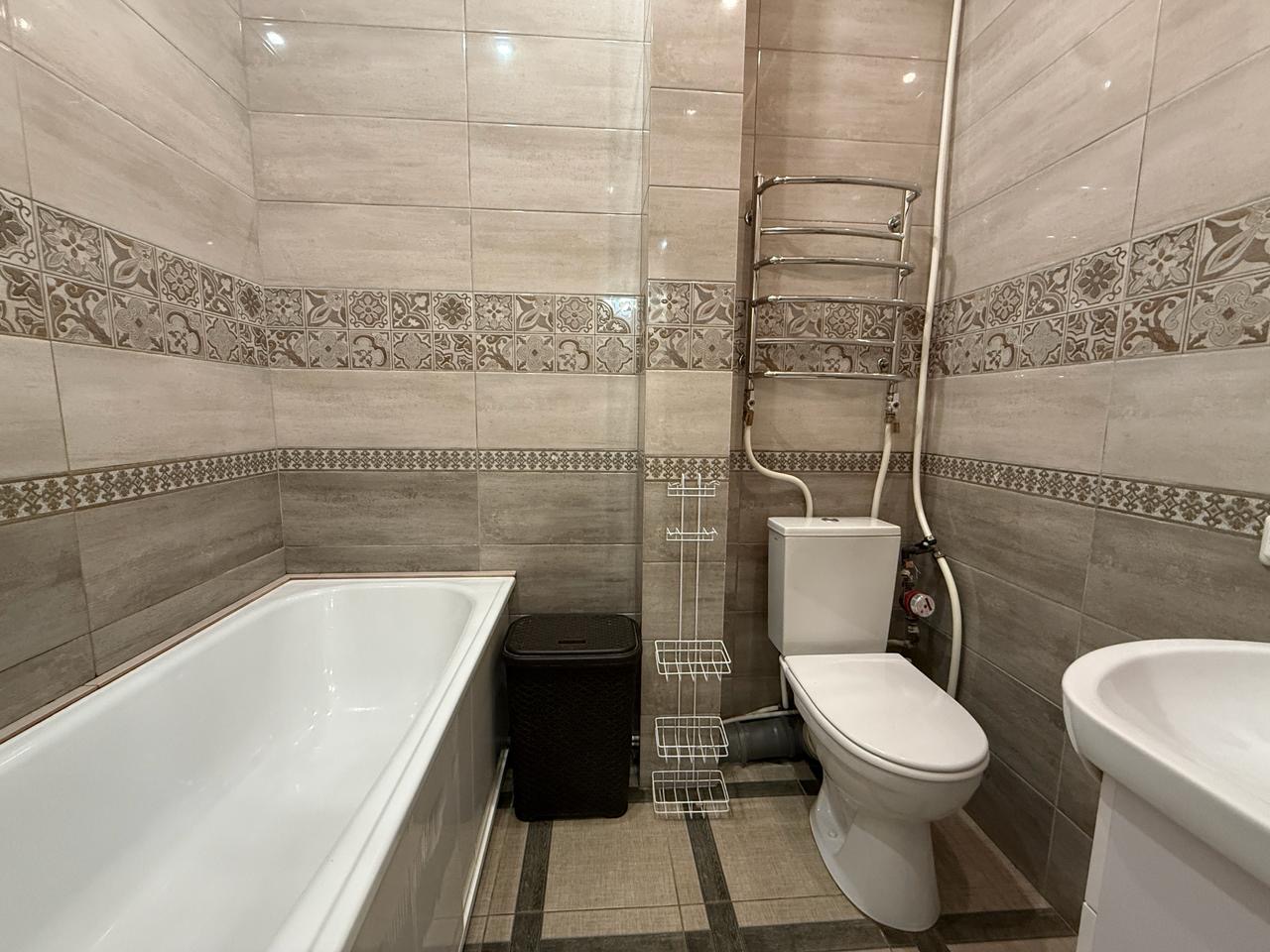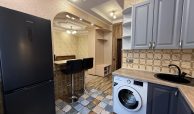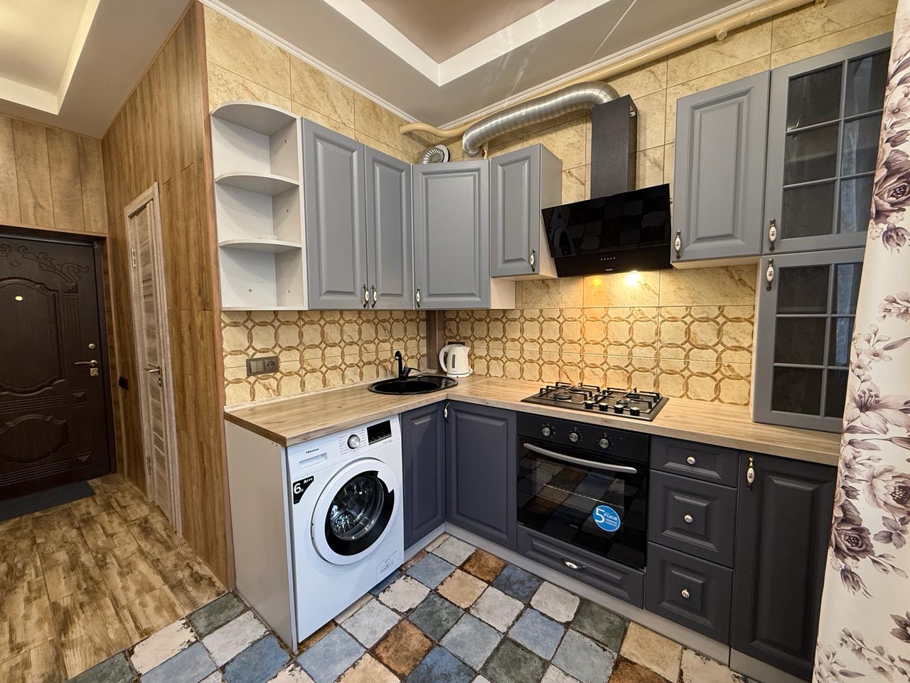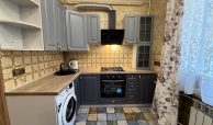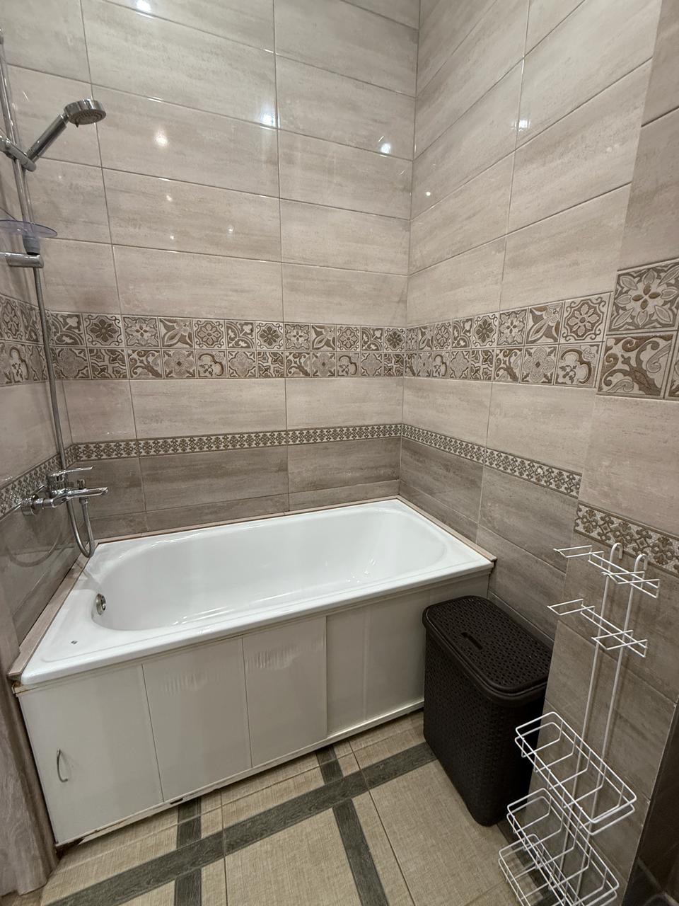 Квартира укомлектована всіма меблями та технікою: пральна машина, холодильник, ел. чайник, газ. плита, ел. духовка, витяжка, газ. колонка, мікрохвильовка, телевізор, кондиціонер, сушарка для рушників, праска, пилосос. Грати на вікнах. Тепла підлога у ванній кімнаті.